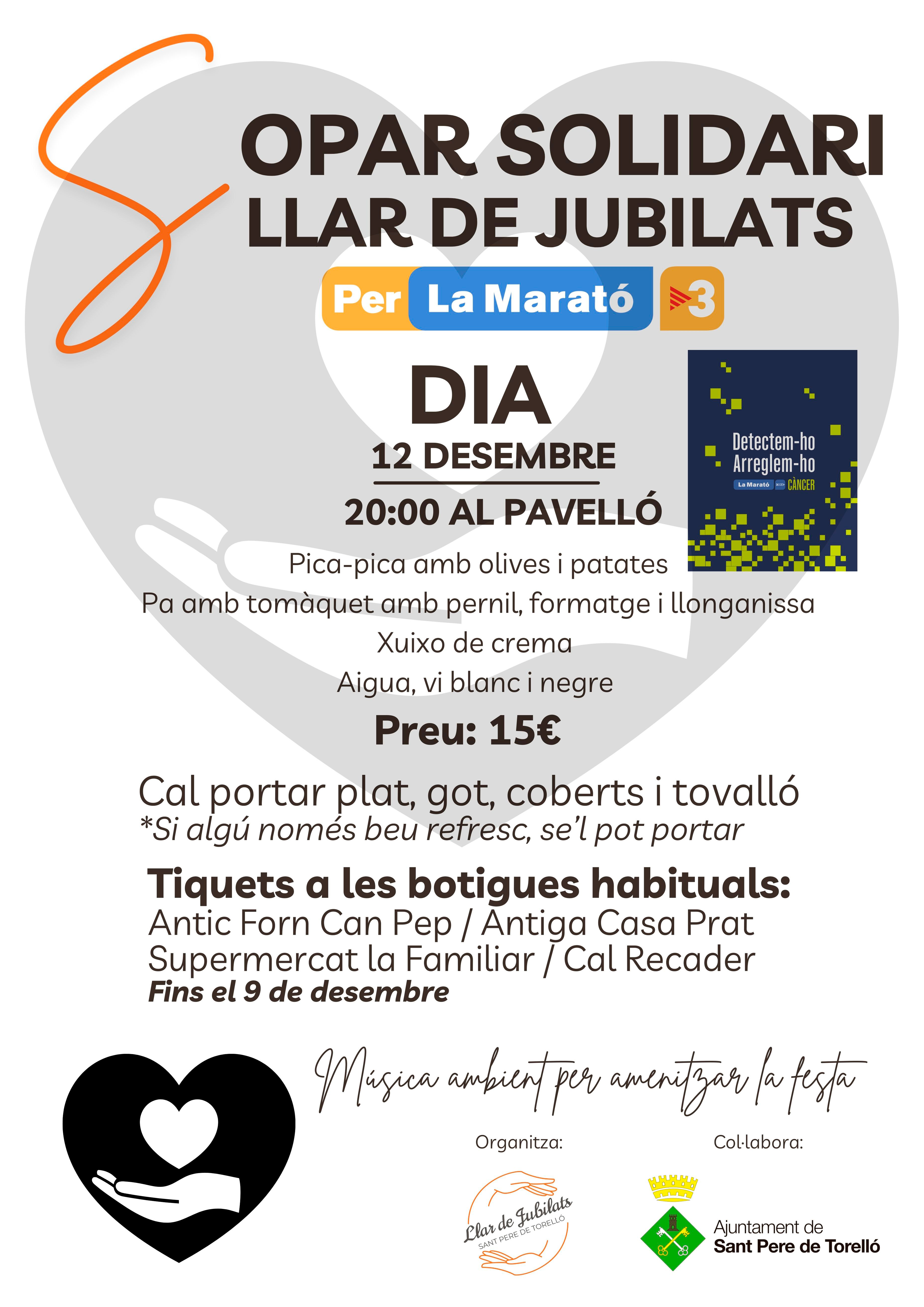 Un any més arriba La Marató de TV3 i a Sant Pere ens solidaritzem per la causa que aquest any està dedicada a les malalties respiratòries. Enguany els actes es durant a terme el diumenge, 15 de desembre a partir de les 10 del matí a la plaça Monmany i es podrà gaudir de: xocolatada desfeta solidària, parades de venda de materials del grup d'Srcrap SPT, llibres, jocs... A 2/4 d&...
